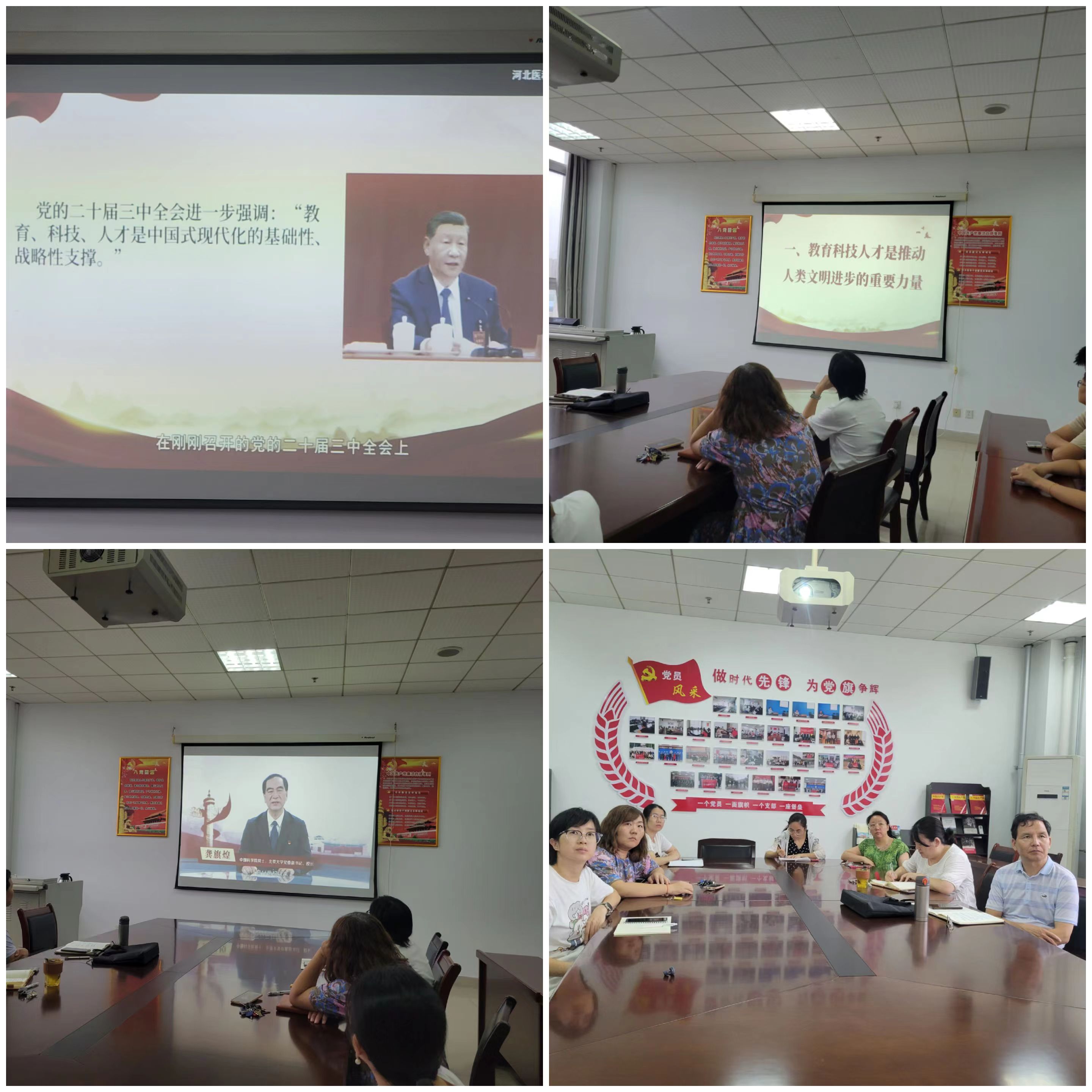 9月4日下午,由北京大学、中国科学技术大学等6所高校知名学者讲授的高校组织示范微党课第二阶段第一讲《坚持教育科技人才“三位一体”,奋力谱写中国式现代化宏伟篇章》在高校思政网、新华网等网站公开直播,图书馆党总支书记刘崇学、副馆长于媛及教职工党员集体观看了直播。