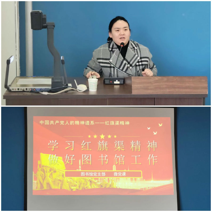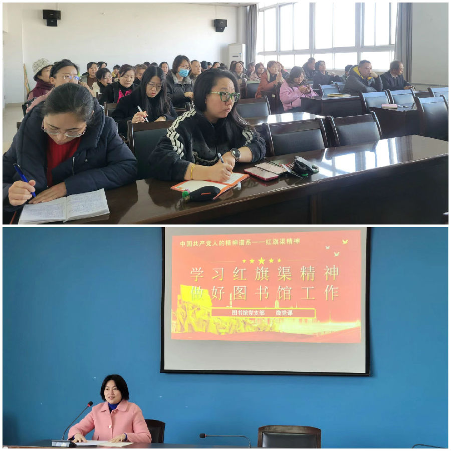 副馆长于媛以《学习红旗渠精神 做好图书馆工作》为题,围绕红旗渠修建的时代背景、开凿历程、蕴含精神等方面生动诠释了什么是红旗渠精神以及红旗渠的奇迹奇在哪里。自力更生,艰苦奋斗,团结协作,无私奉献,是红旗渠精神的实质,也是党的性质和宗旨的集中体现。最后她将红旗渠精神与图书馆工作融会贯通,希望图书馆人发扬红旗渠精神,培养主人翁意识,以“读者第一 服务至上”为宗旨,以团结协作、无私奉献的精神推动图书馆事业高质量发展。