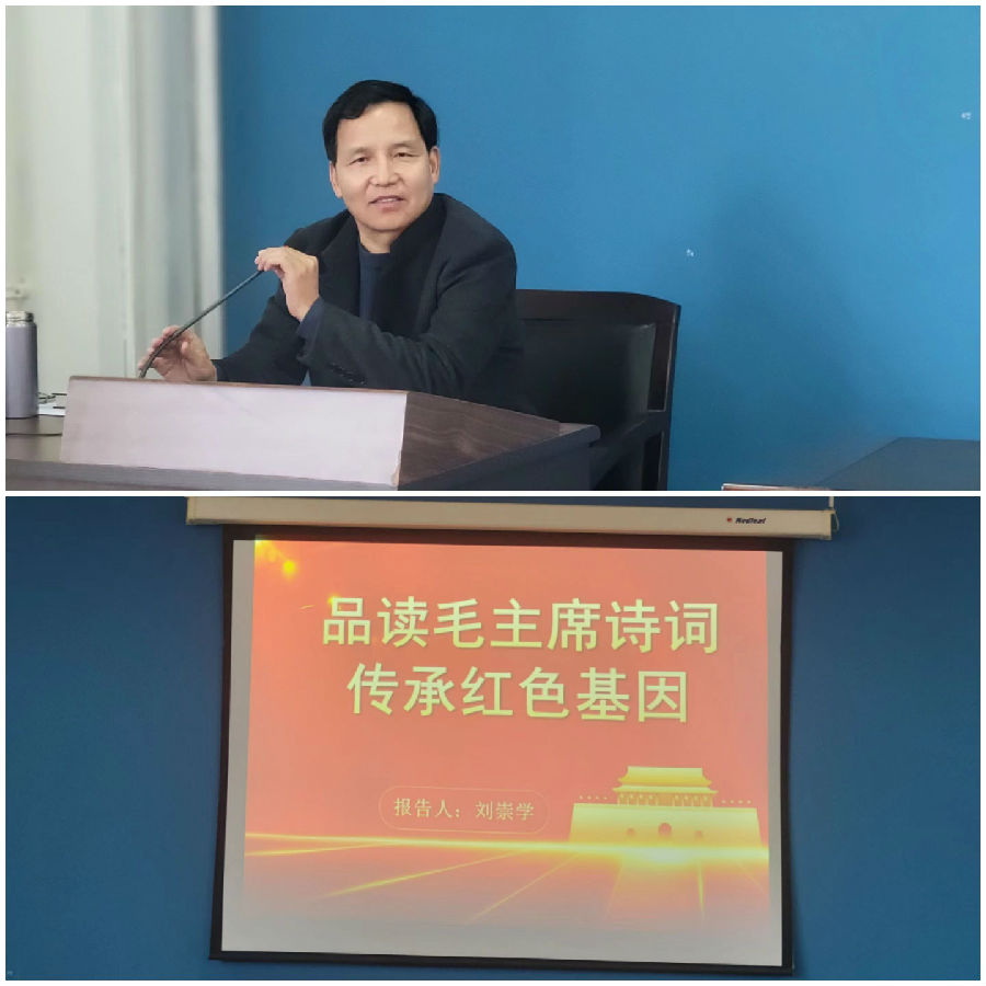 总支书记刘崇学以《品读毛主席诗词 传承红色基因》为题,以毛泽东诗词《沁园春.雪》引入,讲述了海内外学者对毛主席诗词的评价、毛主席青少年时代的读书和求索历程、毛主席诗词的艺术特色和精神内蕴以及习近平总书记对毛主席诗词的引用和发挥,最后带领大家欣赏了毛主席的书法。课上,全体馆员无不被毛泽东同志的至情至性、磅礴大气的诗词所震撼。通过品读毛泽东诗词这一独特方式,了解毛泽东同志艰苦奋斗的一生和中国革命的艰难历程,从中体会中国共产党人的高尚精神和伟岸人格。