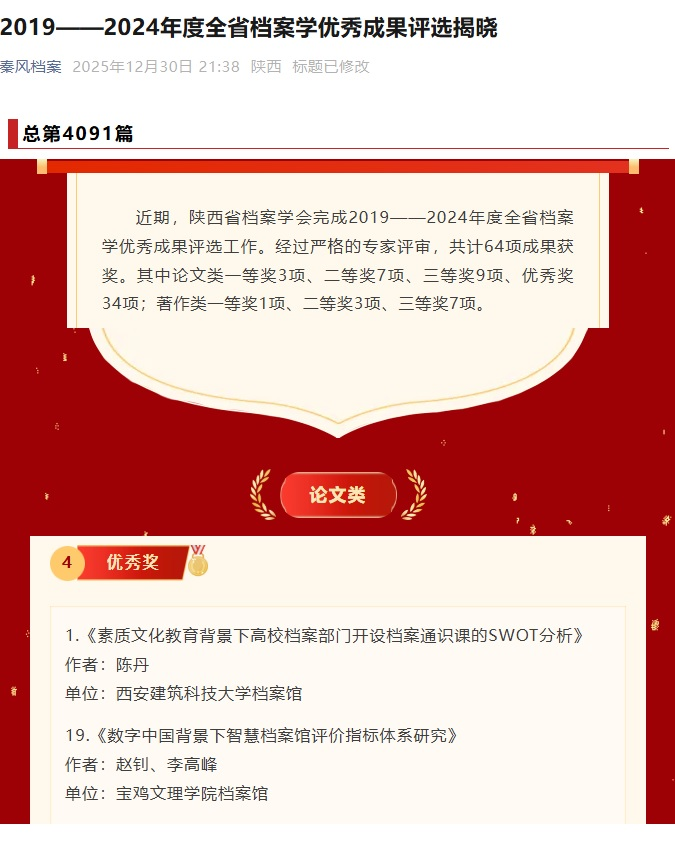 陕西省档案学优秀成果奖由陕西省档案学会组织,评选范围为2019年1月1日至2024年12月31日期间在公开报刊、出版社发表的论文、著作、档案编研成果。经过专家严格评审,最终分别评选出论文类一等奖3项、二等奖7项、三等奖9项,优秀奖34项;著作类一等奖1项、二等奖3项、三等奖7项。