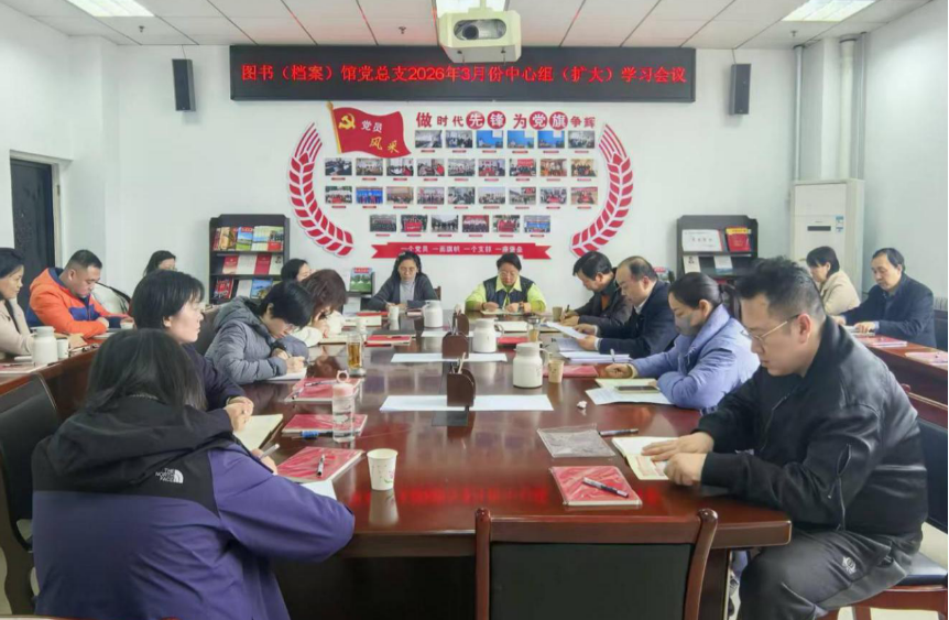 3月12日下午,图书(档案)馆党总支理论学习中心组(扩大)在高新校区图书馆501会议室召开2026年3月份集体学习会。党总支书记、馆长刘景世主持学习会。